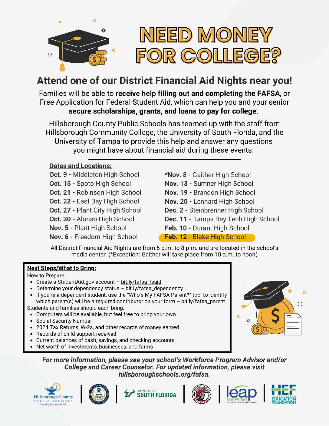 Steinbrenner High School 5575 W Lutz Lake Fern Rd, Lutz, FL, United StatesFamilies will be able to receive help filling out and completing the FAFSA, or Free application for Federal Student Aid, which can help you and your senior secure scholarships, grants, […]