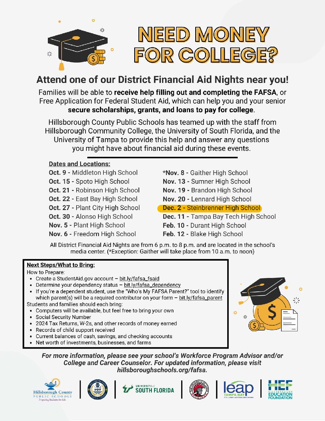 Families will be able to receive help filling out and completing the FAFSA, or Free application for Federal Student Aid, which can help you and your senior secure scholarships, grants, and loans to pay for college. Come visit us from 6pm to 8pm in the Media center. For more information please visit https://www.hillsboroughschools.org/fafsa